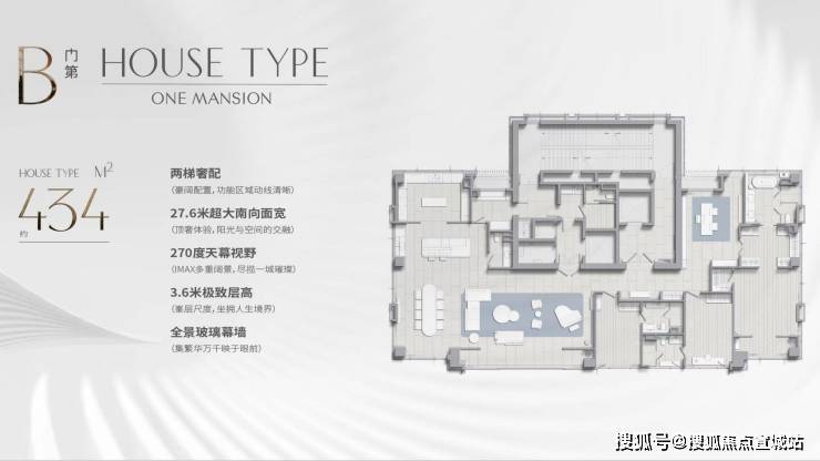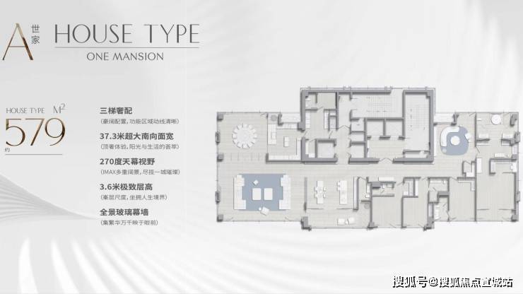 户型面积:仅35席总裁行政公馆,户型建面约435㎡和580㎡,两梯/三梯壹户。