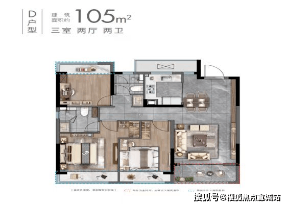 小高层D户型:约105㎡(三房两厅两卫)