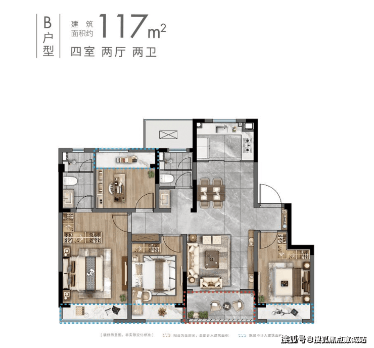 洋房B户型:约117㎡(四房两厅两卫)