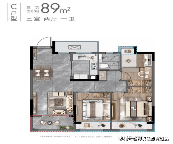 小高层C户型:约89㎡(三房两厅一卫)