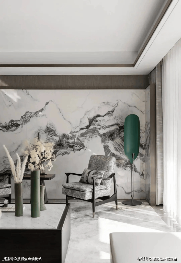 走进客厅之中,仿佛步入一幅山水画作之中一般.组合式的大理石岩板背景墙,以屏风式的形制,赋予了空间一派悠然自得的气韵.