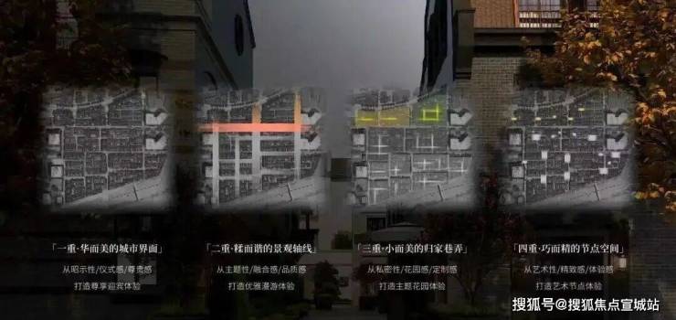 四重景观空间 层层递进的隐居哲学从城市界面到节点空间,由大到小打造“四重空间感受”,营造中西和鸣的感官体验。从华而美的城市道路、糅而谐的景观轴线,美而精的归家巷弄、雅而巧的节点空间,每一处场景皆实现私密与艺术的交融,感受城市繁华与归家宁静的交叠。