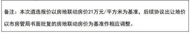 同时本次遴选报价以房地联动房价21万元/平方米为基准,后续协议出让地价以市房管局书面批复的房地联动房价为基准作相应调整。