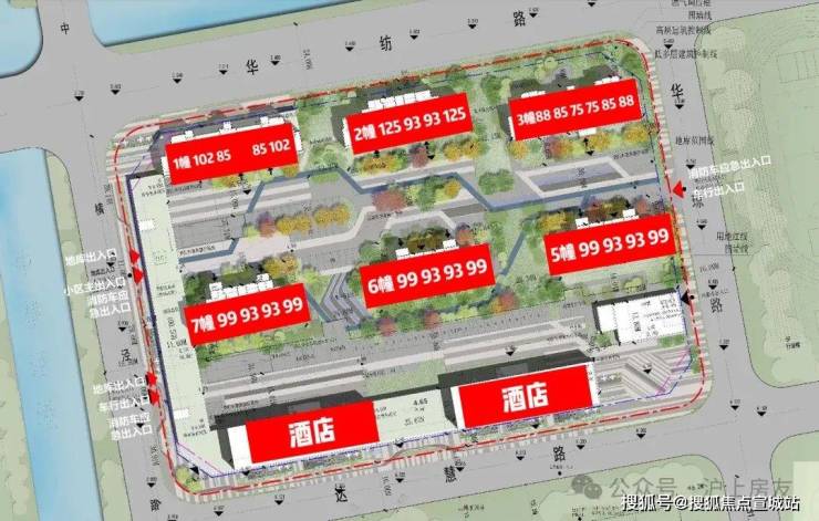 据悉,项目主要出入口分布在项目东侧中横泾路上,包含1个小区主出入口、2个地库出入口、1个车行出入口;另外西侧华琼路上还设置有一个车行出入口。