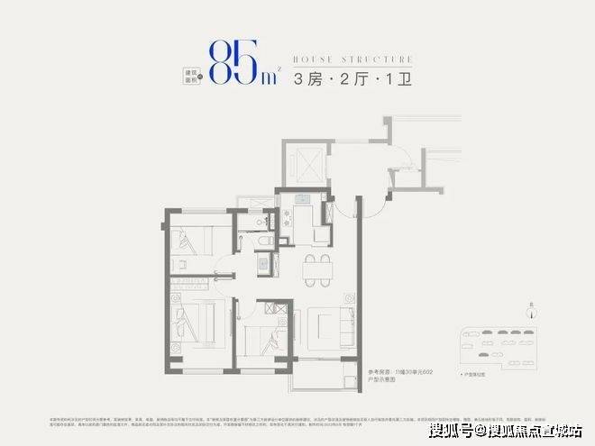 建面约85㎡3房1卫,做到三开间朝南+全卧室带飘窗+卫生间干湿分离+动静分离,非常紧凑的小3房。