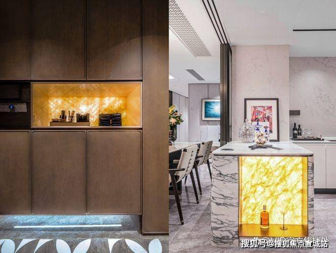 在招商臻境样板间空间的入户玄关处,用木材的温润搭配凝脂发光石材,厨房岛台处同样用天然奢石包裹着发光玉石壁龛