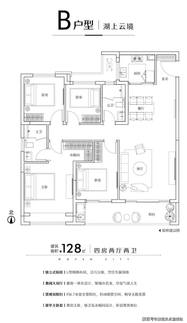 以建筑面积约139㎡为例:“四叶草”设计,让四个卧室格局独立,每位家庭成员都可以享受到无比舒适的起居尺度和私密生活;客餐厅一体化设计,集合了欢聚时光与亲密关系,营造出开放的互动场景;与宽厅自由接洽的跑道式阳台,更打破了空间界限,迎纳风景与阳光入室.