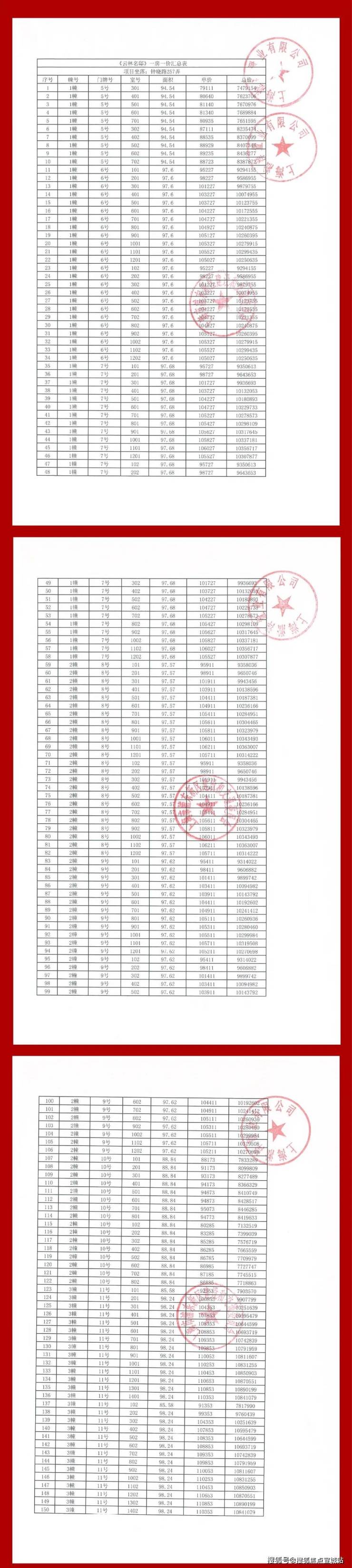 一房一价表如下