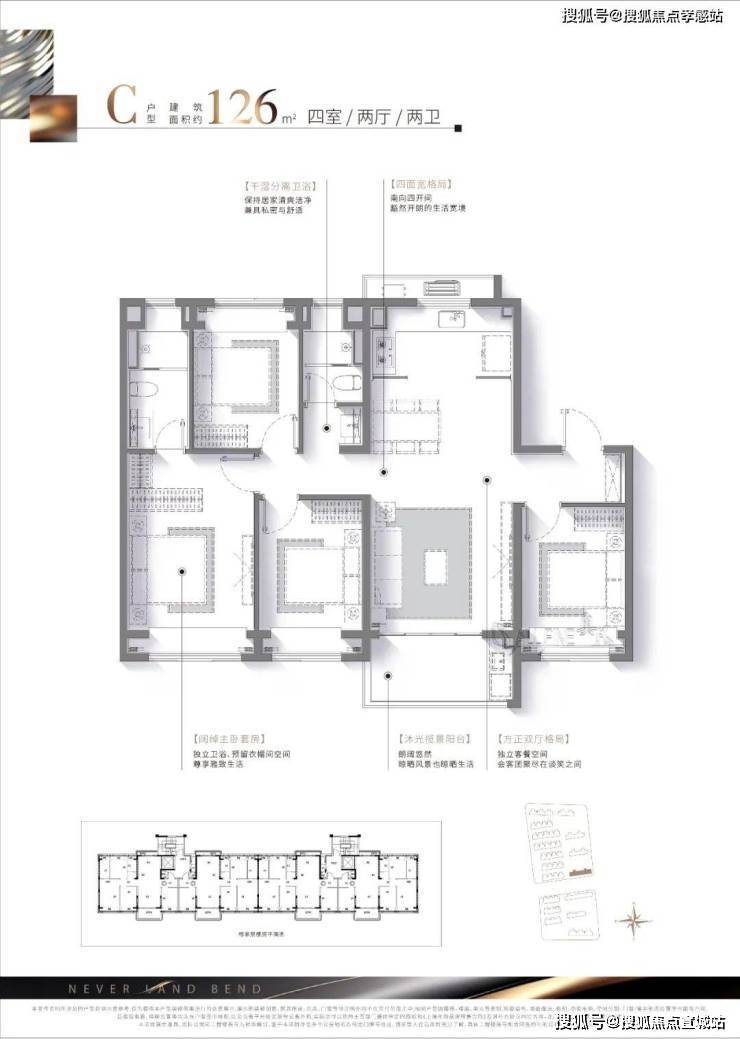 在南向三开间的基础上,该户型“创新横向宽厅,营造百平米少有的客厅尺度“打造3.5南向面宽。