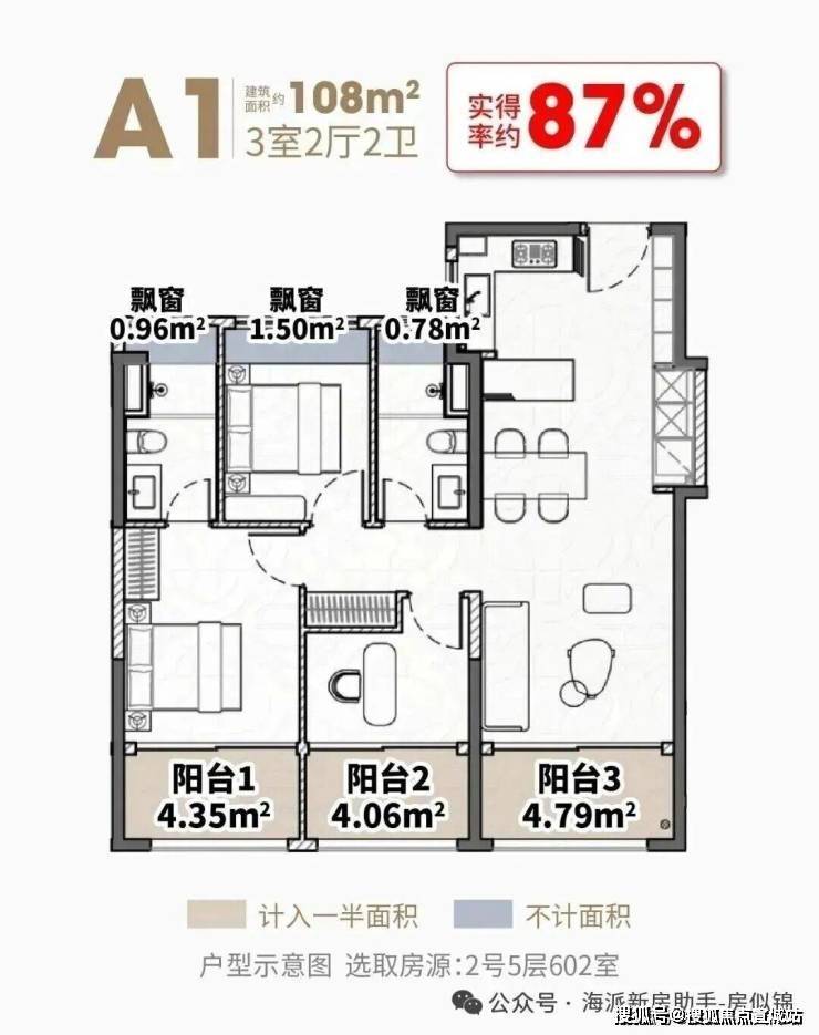 建面约108㎡3房,三阳台面积达约13㎡(赠送一半),飘窗赠送约3.3㎡,室内使用面积达约94.5㎡,实得率高达约87%,总赠送面积比常规次卧都大。