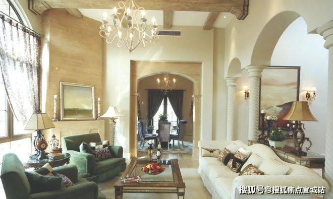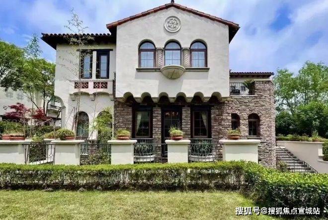 建筑风格采用美国南加州风格,外立面为淡黄色手工抹灰(Stucco)搭配红瓦屋顶,融入原木、铁艺、烟囱等元素。