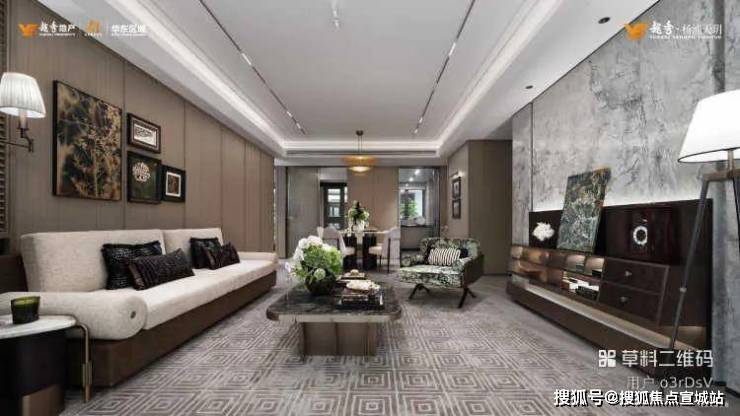 全能玄关·全能收纳玄关选用严选产地巴西的雪山飞狐奢石,对标外滩华尔道夫酒店宽境客厅·敞阔客厅应用健康系统,极致工艺(圆弧形吊顶搭配无主灯设计、定制地砖减少拼缝)
