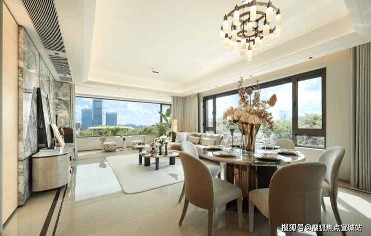 客餐尺度达约7.5米面宽,270°极致环幕窗景,实现了三面采光,无论在客厅、餐厅还是书房,葱郁园景皆如流动画卷,成为空间的主角。