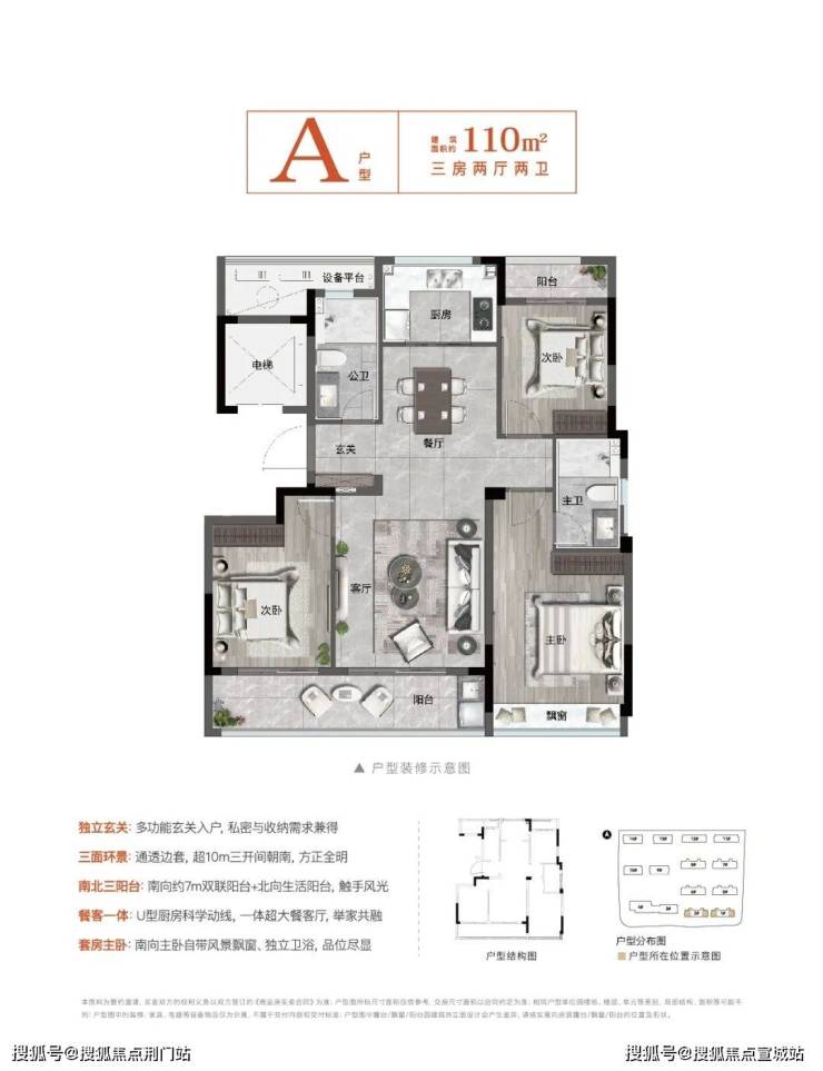约110㎡户型点评:独立玄关:多功能玄关入户私密与收纳需求兼得,三面环景:通透边套,超10m三开间朝南,方正全明,南北三阳台:南向约7双联阳台+北向生活阳台,触手风光,餐客一体:U型厨房科学动线,一体超大餐客厅,举家共融,套房主卧:南向主卧自带风景飘窗、独立卫浴,品位尽显