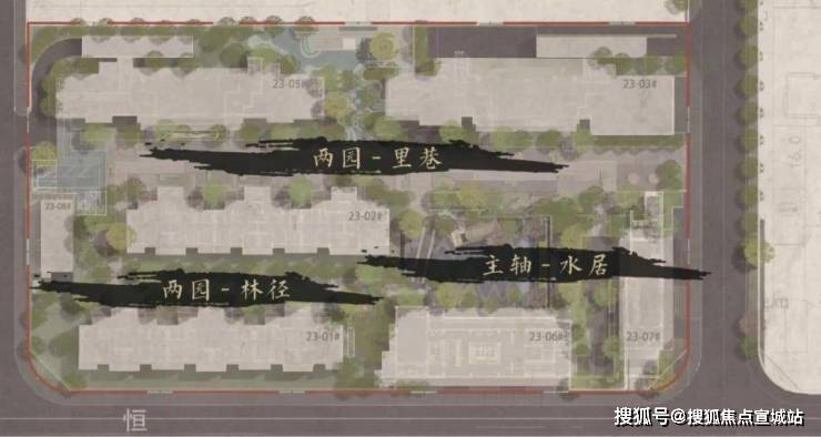 一轴:以水居记忆为轴线串联,打造多个景观节点,形成中心景观游园。