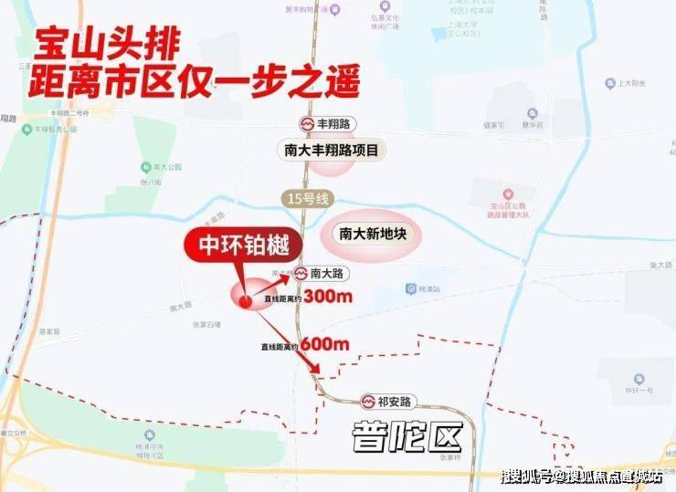 首先,中环铂樾是宝山头排,项目距离普陀直仅约600米,是整个南大乃至整个宝山距离市区最近的一个。