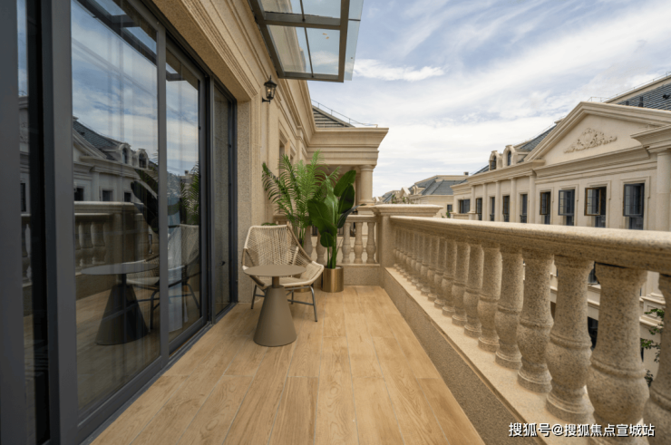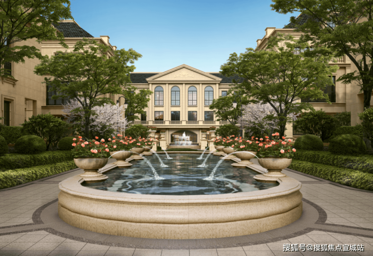 整个园区,以经典的绿城法式墅区景观大中轴贯穿,占地约1000多㎡,联排建筑的设计,融合了中国传统院落布局与法国枫丹白露宫的审美,外立面大面积采用全石材干挂,檐口等细节部位使用仿石。