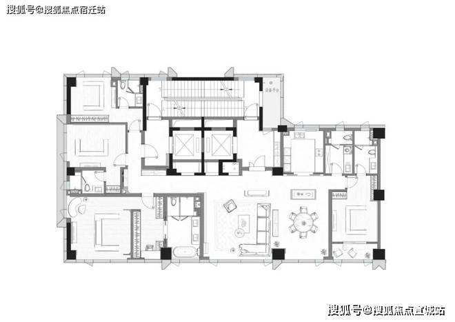 横向L型走廊,开阔洄游动线模糊界限,放大空间的优势拓宽视觉感受,同时,LDK一体化全家庭社交厅,动静分区、南北通透、岛台设置……空间以相互交错的平面圆弧为层次结构,在互动间让心灵情感升温,带来全维感官享受上的跃升。