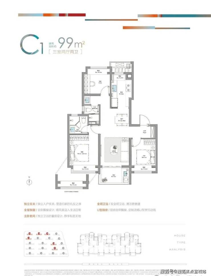 建面约99㎡C1户型则是典型的三开间朝南飞机户型,整个套内几乎没有走道,拒绝空间浪费,让业主有更加出色的居住尺度感。