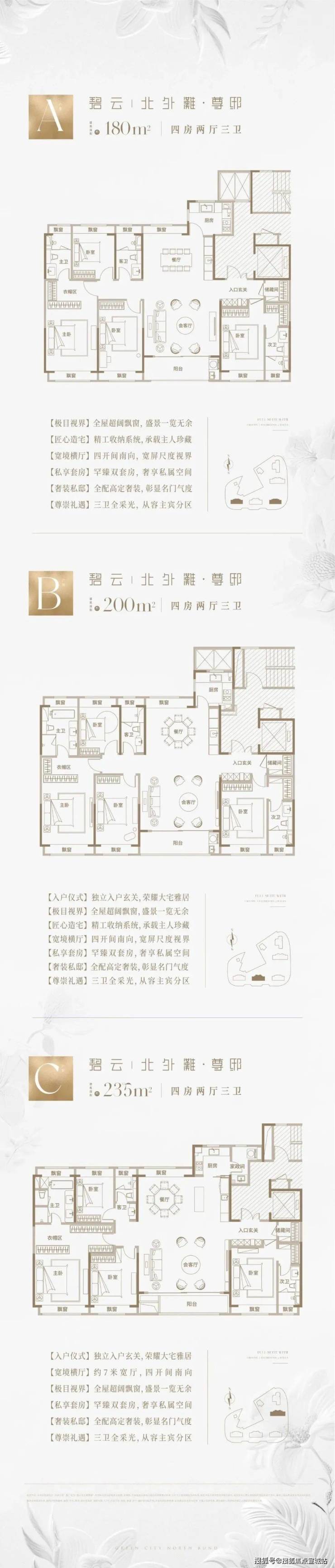 户型:约180-200-235㎡,少量1楼底复带花园