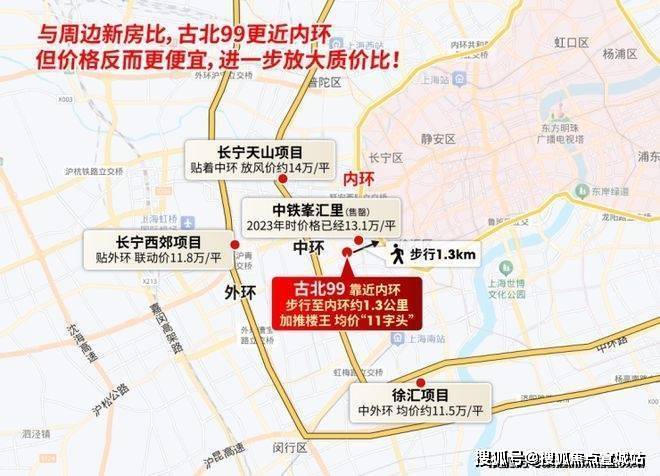 其次,古北99步行到内环只有约1.3公里,均价“11”字头,而长宁天山项目贴着中环,预计14万/㎡;长宁西郊项目贴着外环,联动价11.8万/㎡。