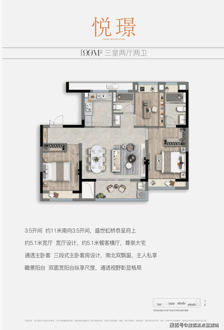 户型点评:百平左右的户型打造三室很常见,但能同时做到南向3.5开间属实难得;餐客横厅更是达到了约5.1米的宽度设计,大幅提升了生活舒适度、以及实用性;主卧套房,涵盖步入式衣帽间与独立卫浴,南向自带飘窗,缔造尊贵私密私享。