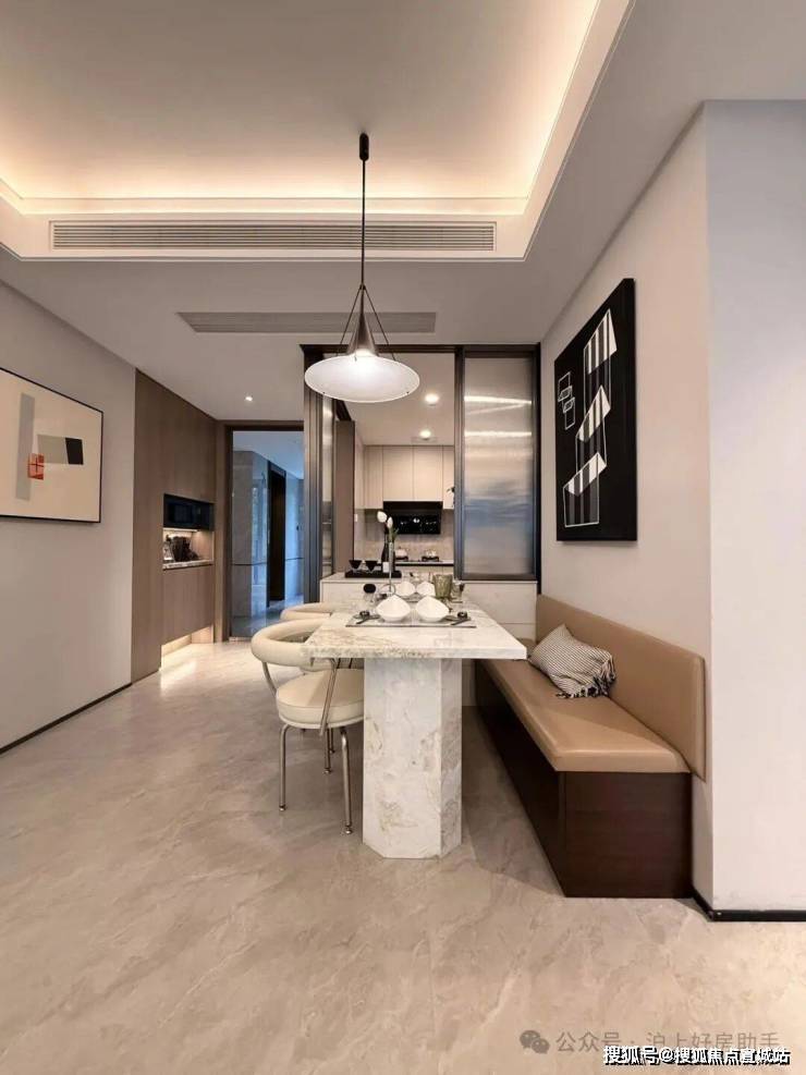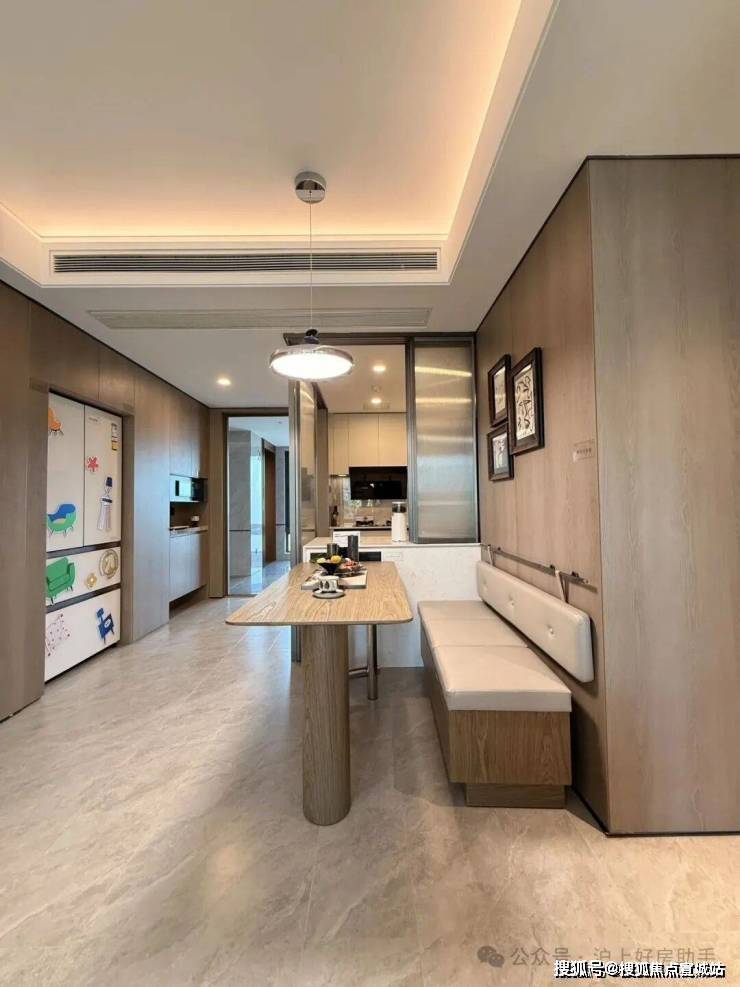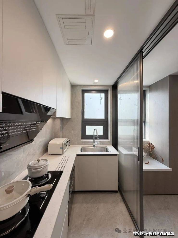LDKB一体化设计。 通过金属玻璃移门和岛台联动,达成餐厨一体,增加家庭成员互动。烟道外置以及S墙内嵌设计,优化空间布局,提升台面使用感和转角柜使用频率。