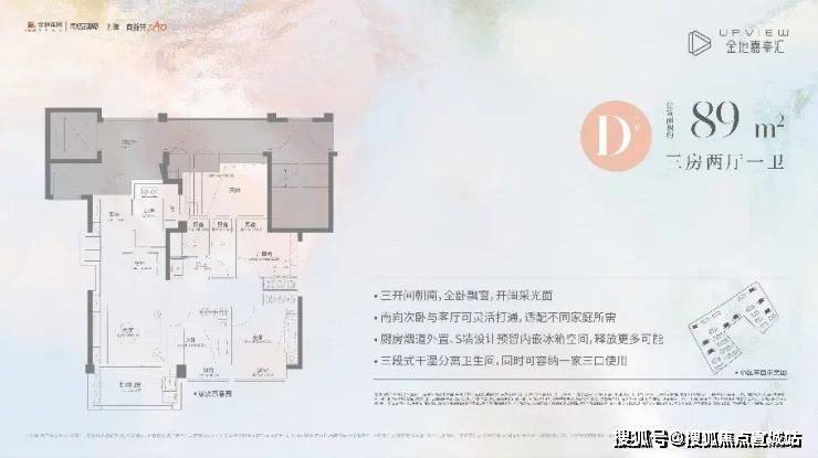建面约89㎡三房两厅一卫(D户型), 不仅功能完备,而且很好地把控了总价,约350万起即可上车高配品质三房,堪比市场上110平左右的空间感!