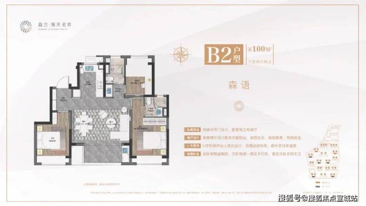 1、建面约100㎡三房两厅两卫,市场主流户型。客餐横厅设计配多功能阳台,优势在于更大采光面和更好通风效果,把过道纳入到客厅和餐厅的空间中来,使整体空间得到更好的利用。