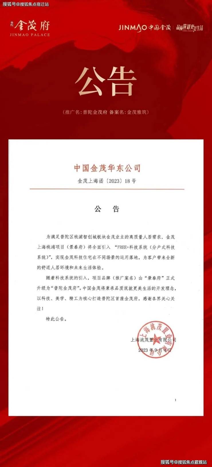 2023年9月4日,中国金茂华东公司发布一则公告:金茂上海桃浦项目(景泰府)更名为普陀金茂府预约热线:400-882-8814☎。