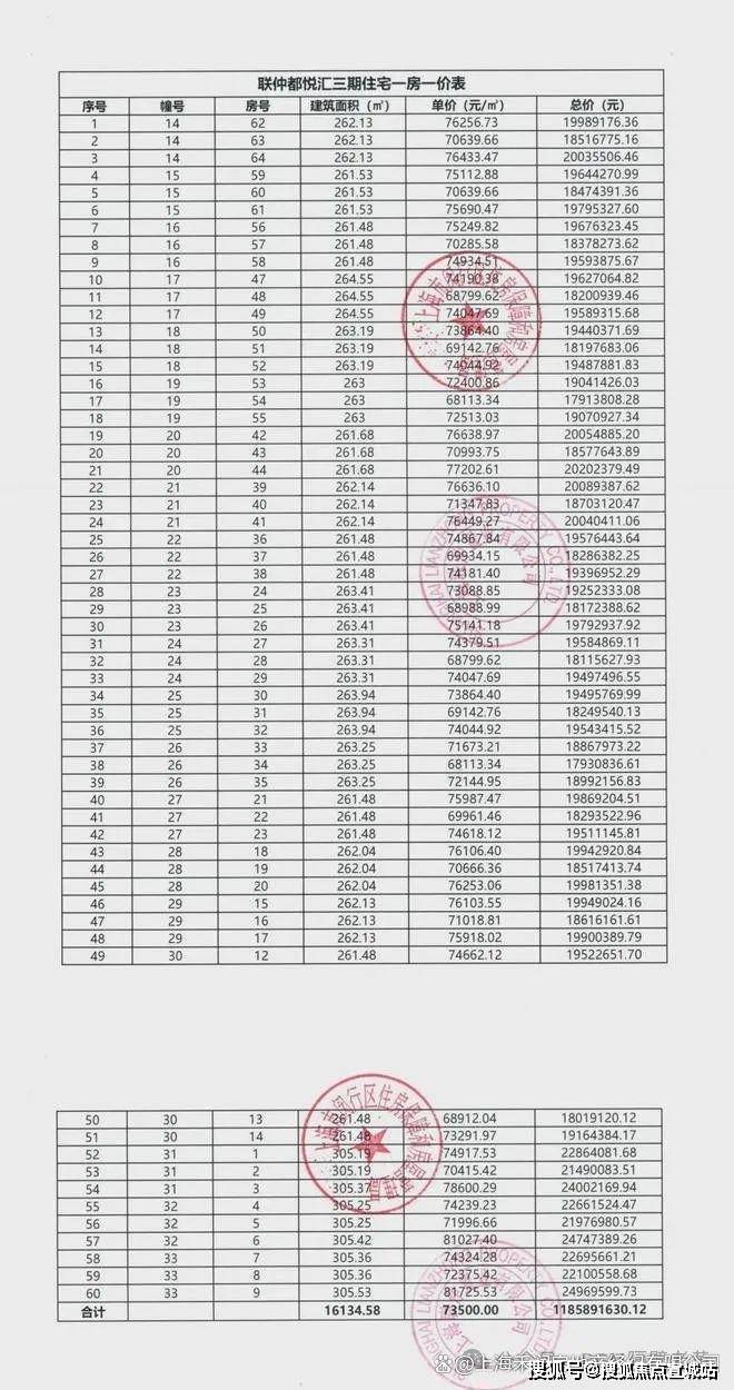 一房一价表如下