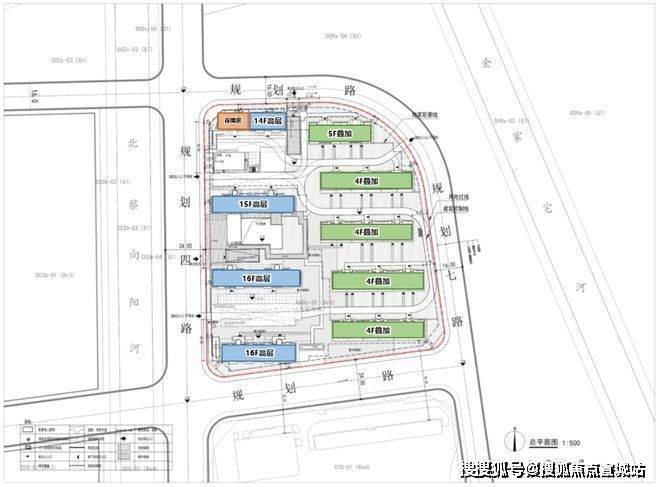 地块拟建4幢14-16层高层住宅,以及5幢4-5层多层住宅,配套公建用房和社区配套设施;地面没有停车位,全部人车分流。