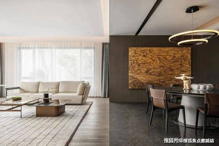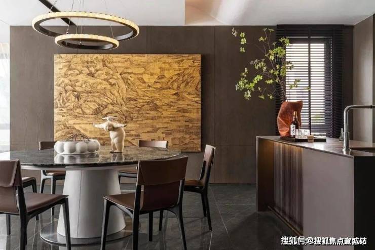 客厅与餐厅的交汇地带通过精心挑选的差异化地板材质,设计师巧妙地构筑起一道无形的软性分隔屏障,餐厅中央设置的开放式岛台,不仅作为烹饪与聚餐的灵活中心,还巧妙地将空间功能进行了转换与融合,同样的作用也在吊灯的设计上显现。墙面上悬挂的巨型壁画,导着居住者的审美情感,让生活空间充满了故事感与个性色彩。