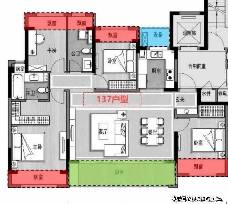 小高层137平米户型:四房两厅两卫大面宽短进深设计,四开间南向大面宽横厅,全屋飘窗利用率超高;