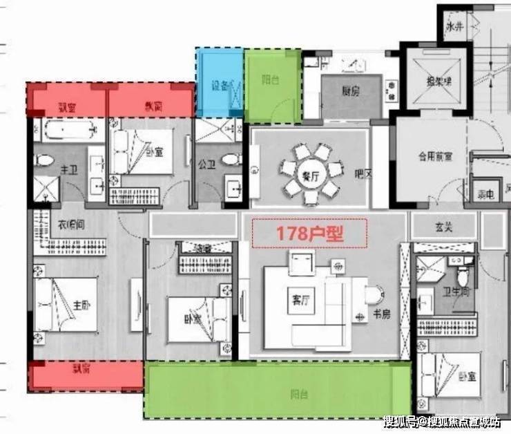 小高层178平米户型:终极改善绝版大平层,双套房三卫设计五开间朝南,9米南向三阳台;
