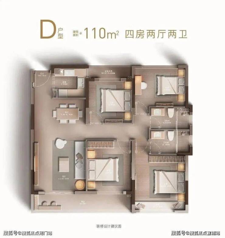 建筑面积约110㎡均为边套户型,纵享丰富观景视野,四房两厅两卫设计并蓄尺度感与尊崇感。