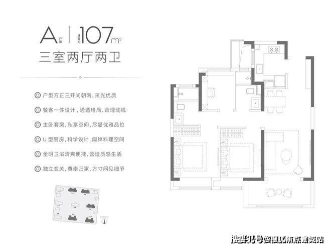 该户型集LDBK一体化、玄关入户、动静分区设计、U型厨房、双卧飘窗、强大收纳等多重优势于一体,在功能性与舒适度上几乎都做到了极致!