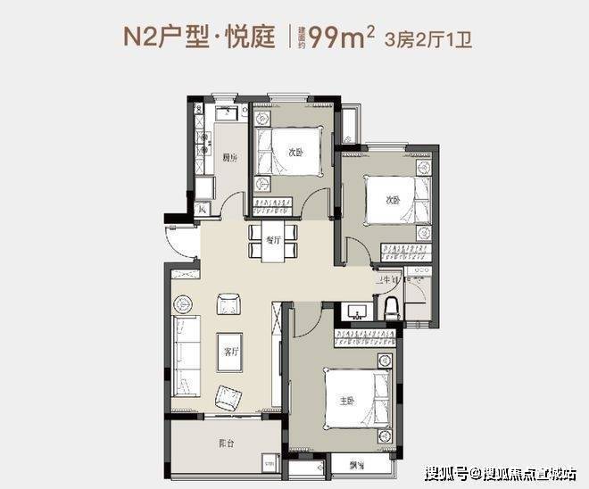 99平方米的3房2厅1卫户型图
