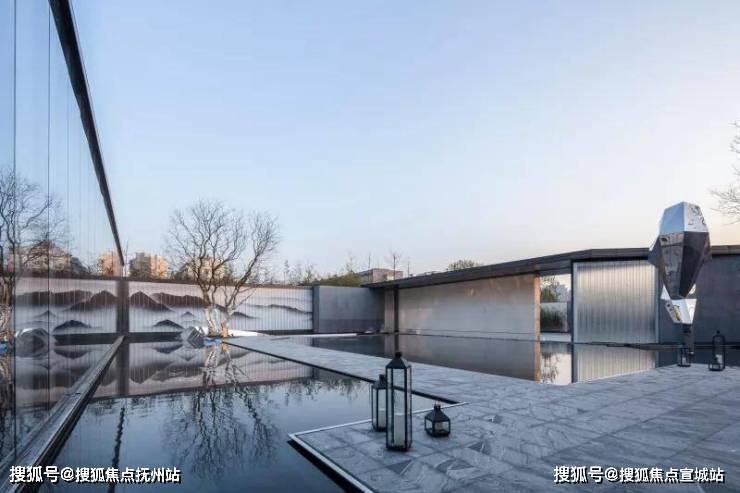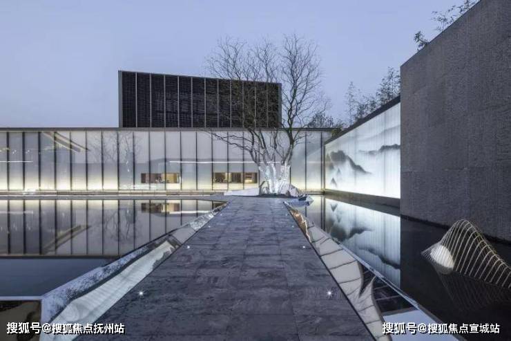 穿过大型玻璃构筑,走进前场。门楼前开阔的广场,昭示了元垄·华著“现代化、城市化”高端楼盘的定位。穿过西周直江上的景桥,即可看见景观水帘,水流淅淅沥沥地流淌,灵动悦耳,与简约的门楼相互映衬。踏上台阶,超大水面映入眼帘,水中倒映着简约现代、充满绍兴特色的销售中心建筑。