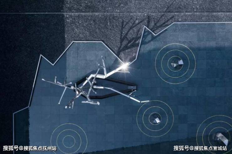 镜面水景倒映着建筑的倩影,水面与建筑融为一体。人们踱步经过,从水景侧边的镜面不锈钢中,不断看见自己的身影,趣味十足。黑色的池底,仿若一方墨池,呼应绍兴后马八景之一的“趣园墨池”。景观雕塑仿照绍兴柯岩云骨之形,静于水面,正气凛然。