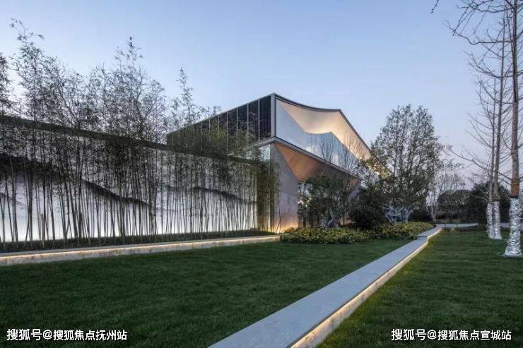 示范区后场面对水质良好的西周直江,设计团队打造了滨河景观带。沿建筑玻璃立面处设计的平台空间可用作室外洽谈区。景观设计采用现代市政手法,树阵广场结合草坪,局部种植花卉。人们于沿河外挑木平台上休憩,可观看沿河风光。草坪、花田、滨河景观打造出“花梗渔唱”之景。