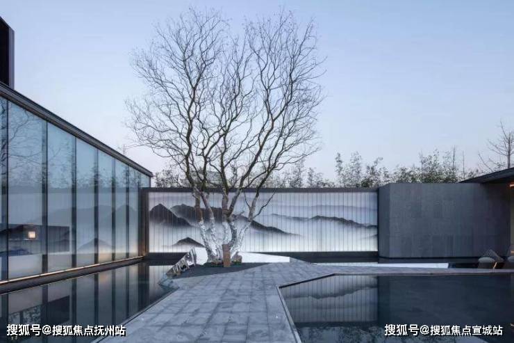 景观门楼既是入口,也是前场的景观连廊。步入连廊,一面内置水乡特色山水绢画的U玻景墙展现在人们面前,水墨韵味满盈。