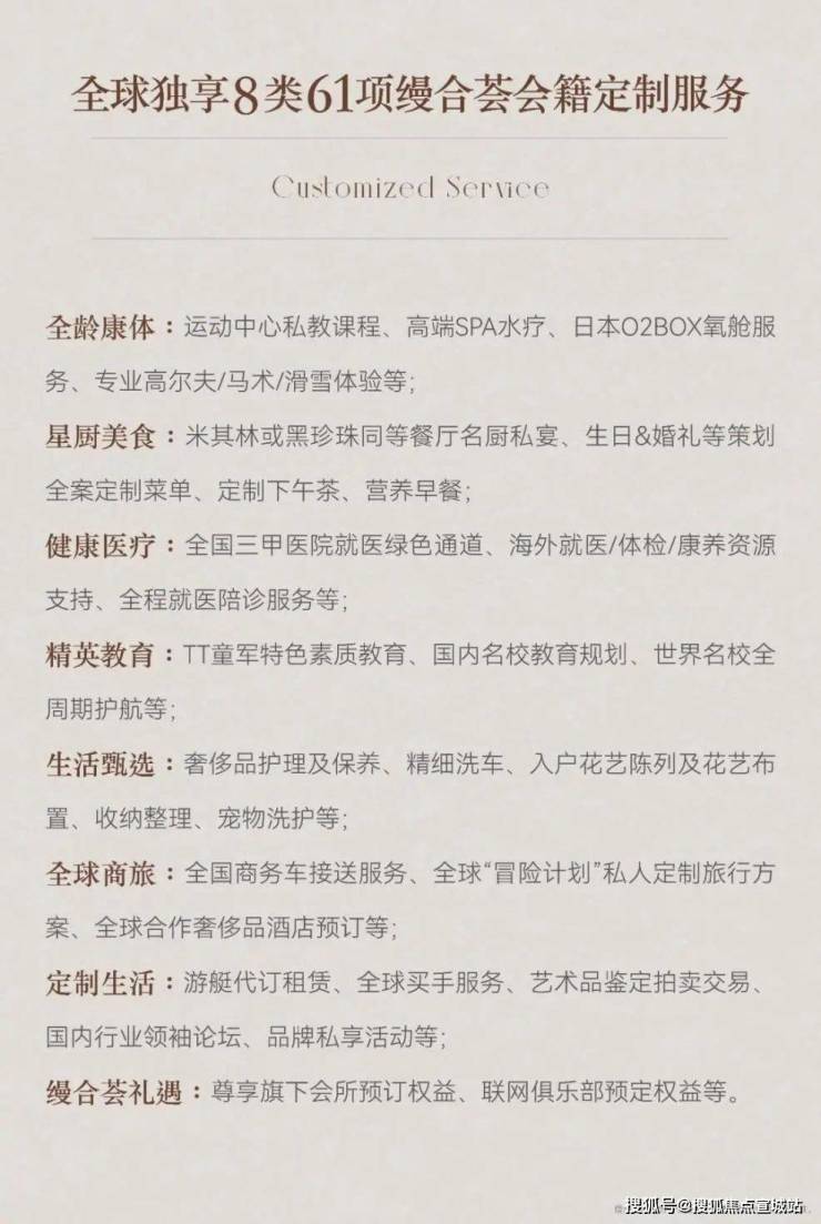 有社交、商务、运动、志趣、亲子5大主题,涵盖精致私宴、恒温泳池、健身房、儿童培训、风雅茶室、多功能厅等,并链接8类61项全球顶级资源,从运动、教育、旅行、医疗等多维度,成就与世界的共叙、与时代的共鸣。