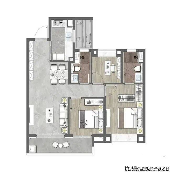 该户型做到了三开间朝南+超大面宽横厅+主卧套房设计+卫生间干湿分离+南北通透,功能性和尺度感完美结合。