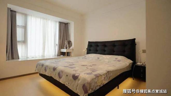 卧室通过黑、木、白三色构建出既沉稳又温润的休憩空间。黑色软包床(视觉重量100%)+原木地板(重量60%)+白墙(重量20%)营造悬浮感,此搭配使12㎡卧室获得15㎡的空间感知。
