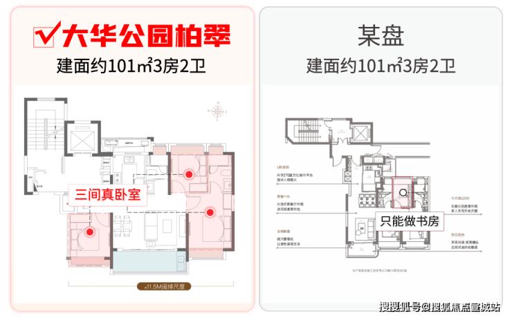 相比竞品户型的 2房+1个功能房 ,其功能性天壤之别。