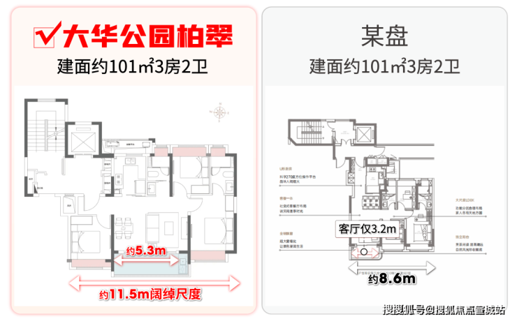 但大华公园柏翠的建面约101㎡3房2卫,却很好的解决了以上所有问题:
