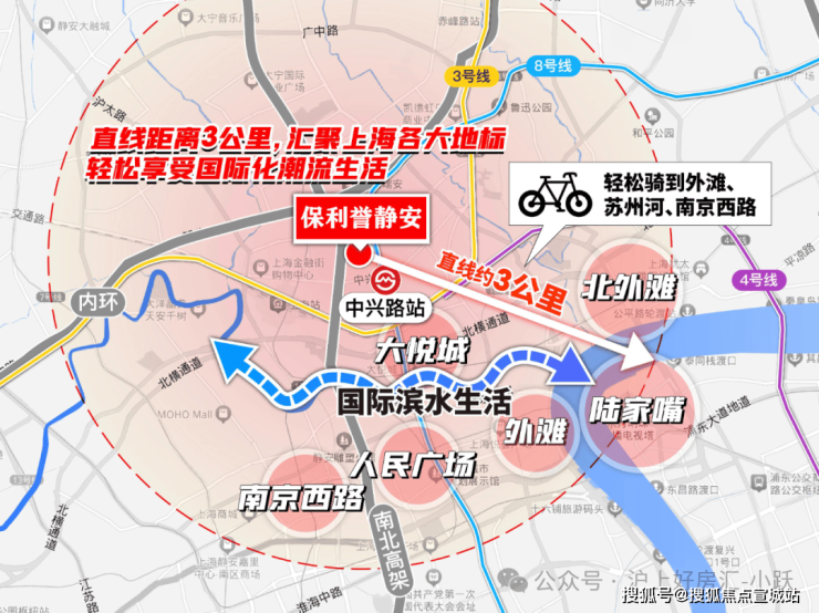 而项目到外滩和平饭店的直线距离正好是约3公里!妥妥的城心烫金地段!