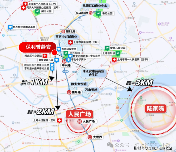 1公里范围内有静安大悦城、万象天地、凯德虹口商业中心、百万中兴城商业(在建中)、珠江安康苑的商业合生汇(在建中)等大型商场。