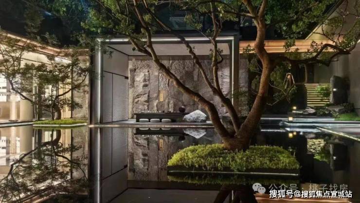 这座水庭也是一整面「水镜」,将中心的乌桕树、周围的超大白玻、精致的艺术雕塑都倒映其中。